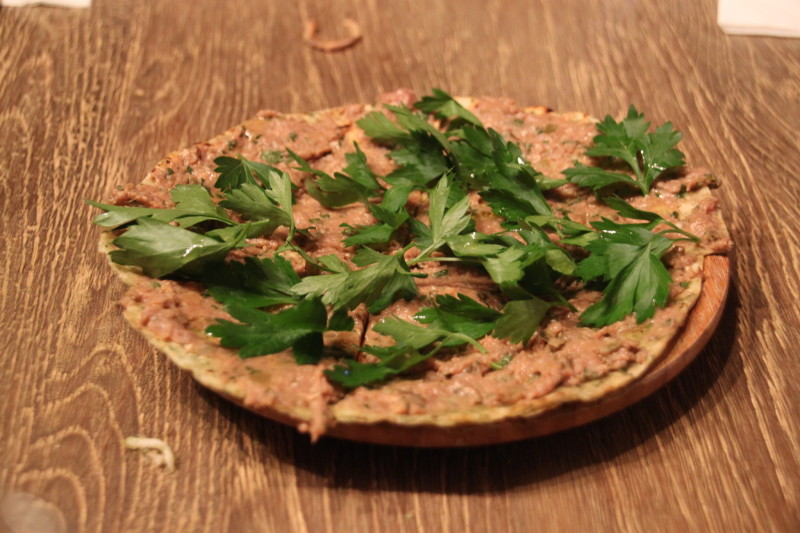 Ardından enfes bulduğum bir yemek geldi masaya: “Steak Tartare Lahmacun” Worcester sos, kapari, turşu, soğan, ketçap ve hardal ile tatlandırılmış bonfile kıyması. Bana kalırsa damaklara bayram ettiren, insanın içine mutluluk yayan bir yemekti bu. Benim için, bildiğim lahmacunun, soğuk soğuk yenen, daha lezzetli bir çeşitlemesi gibiydi.