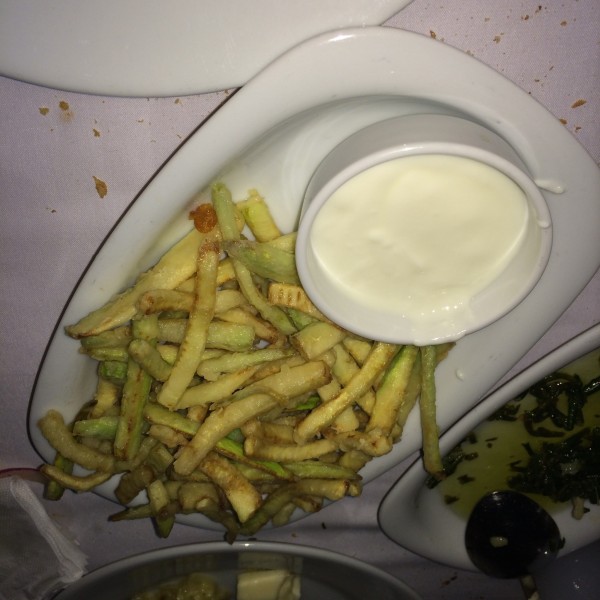 Ne mi yemeli? Bence Ogün’ün şaşırtıcı yanlarından birisi kabak kızartmasıdır. Bu “kabak tava” mevzuunu irdelerken, arşivimin tozlu raflarına el atmam gerektiğini her zaman çok iyi bilirim, zira nice mekanlarda yediğim bu yemeğin iyisini gördüm mü mutlaka paylaşmak ve diğerleriyle karşılaştırmak isterim. Ogün’ün kabak kızartması, diğer mekanlardaki gibi madalyon formunda, ya da elips şeklinde değil, alıştığımız patates kızartması formatında kalem gibi ince ince gelir önümüze. Yağı çekmemiştir, diri ve lezzetlidir. Yoğurt ve sarmısaktan mürekkep sosu ise insanın burnundan gelen türden yakıcı bir karışım olmaktan ziyade, hafif ve kabakla uyum içinde rakseden bir güzelliktir. Siz siz olun, Ogün’e gittiğinizde muhakkak bir kabak tava sipariş edin. Memnun kalacaksınız. Aynı duyguları, Eleos’un hafif peynirli, Todori ve Seviç Meyhanesi’nin çıtır çıtır kabak kızartmaları için de hissettiğimi bilmenizi isterim. Kabağın birinci ligi bu saydıklarımdan oluşmaktadır İstanbul’da.